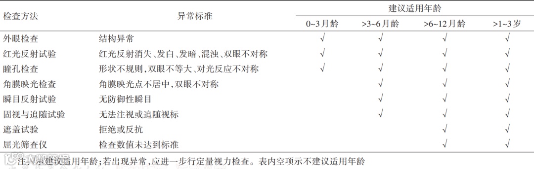 ➤基础眼部检查:基础眼部检查包括眼部外观、红光反射试验、眼位和眼球运动、睫状肌麻痹下视网膜检影验光、眼底等检查。建议适用年龄和标准见表1。