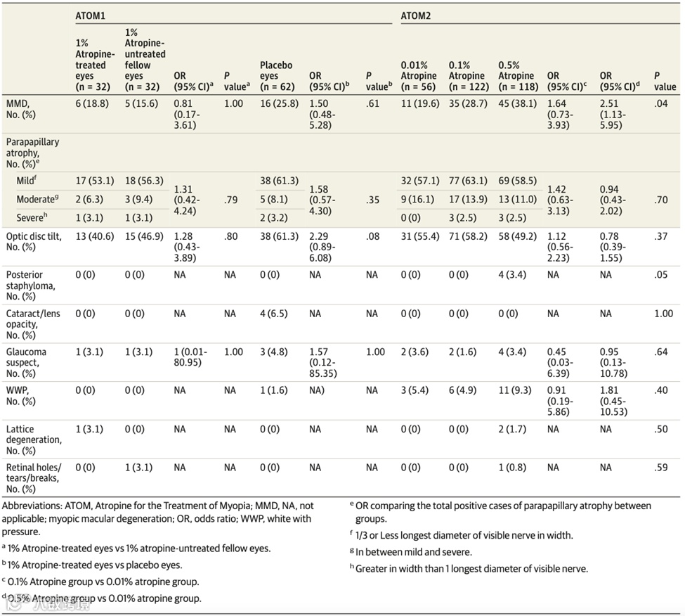 这些研究参与者在阿托品治疗后的10年或20年后,潜在的治疗或与近视相关的眼部并发症的发生率总结如表3所示。在ATOM1的参与者中,1%阿托品治疗组与未经治疗或安慰剂组相比,白内障/晶状体混浊、疑似青光眼、近视性黄斑变性(MMD)、视盘周围萎缩(beta/gamma区)和视盘倾斜的发生率没有差异。在ATOM2的参与者中,0.01%、0.1%和0.5%阿托品组的MMD发生率分别为19.6%、28.7%和38.1%(0.1% vs 0.01%:OR,1.64;95% CI,0.73-3.93;0.5% vs 0.01%:OR,2.51;95% CI,1.13-5.95;P = .04)。