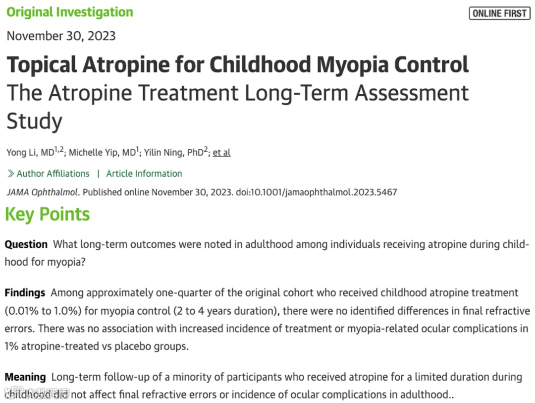 JAMA Ophthalmology | 阿托品延缓近视儿童进展:10-20年长期随访的有效性和安全性研究(ATLAS)