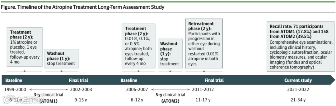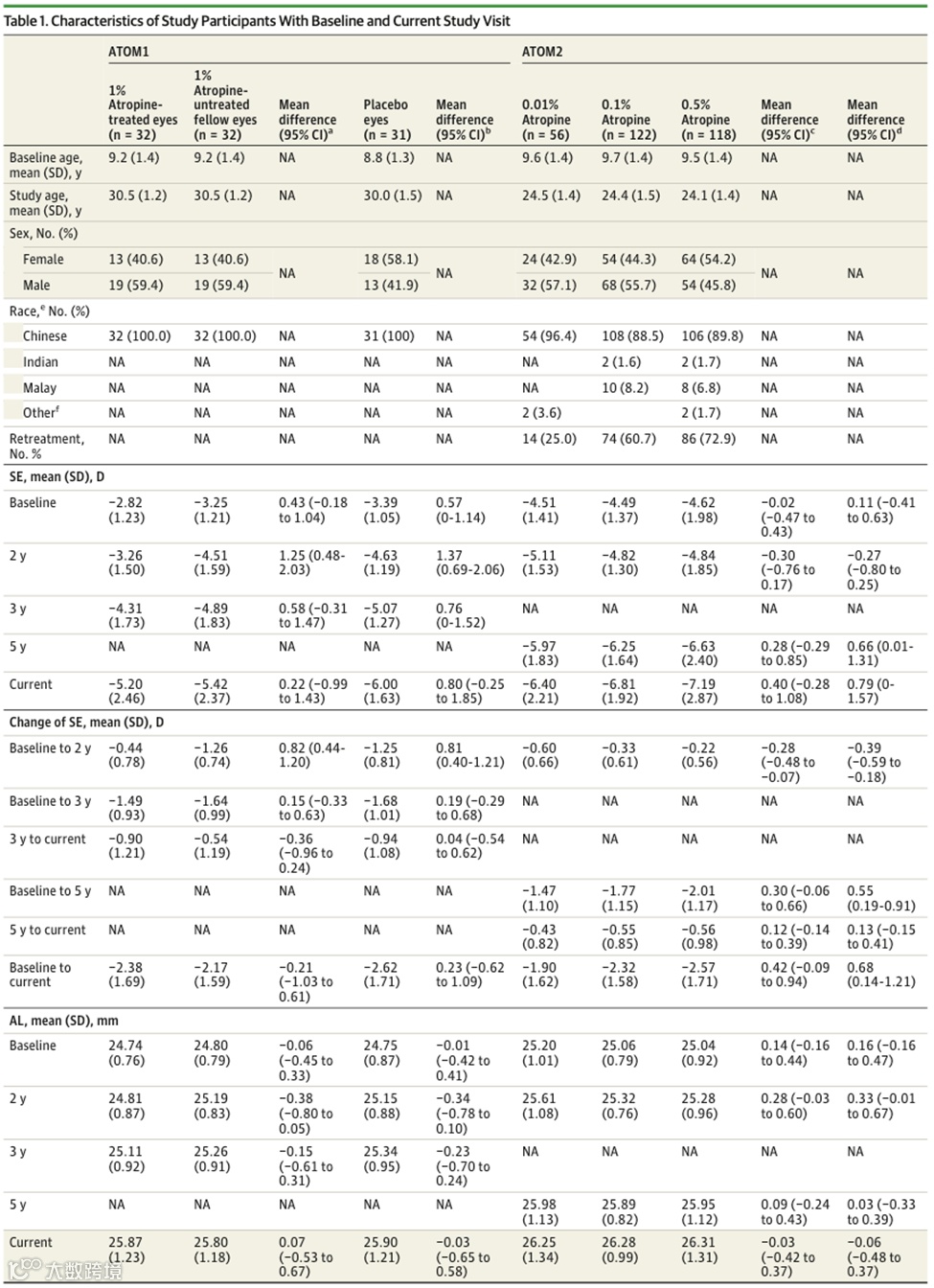 该研究包括ATOM1和ATOM2临床试验的参与者,分别在他们最后一次试验随访后近10年和20年进行评估。ATOM1研究始于1999年。这是一项单中心、随机分组、双盲、安慰剂对照的试验。研究对象包括了400名年龄在6至12岁之间、等效球镜度(SE)在-1.0至-6.0 D之间,散光-1.5 D或更低的儿童。这些儿童每晚使用1%的阿托品或安慰剂,使用两年(第一阶段)。停止阿托品治疗后,他们继续随访一年(第二阶段)。在接受阿托品治疗的组别中,随机选择一只眼治疗,另一只眼接受安慰剂。ATOM2研究始于2006年,是一项单中心、双盲、随机临床试验。参与者包括了400名年龄在6至12岁之间、屈光度至少为-2.0 D,散光-1.50 D或更低的儿童。他们被随机分配每晚使用0.5%、0.1%和0.01%阿托品,使用两年(治疗阶段),之后停药一年(清除阶段)。在清除阶段,如果儿童至少有一只眼的近视度数增加了-0.50 D或更多,他们将重新开始使用0.01%的阿托品治疗,继续治疗两年(再治疗阶段)。