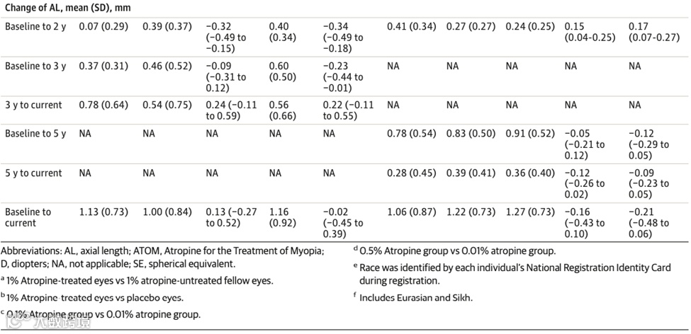 结果:在最初接受阿托品治疗(0.01%至1.0%浓度,治疗持续2至4年)的约四分之一原始队列中,最终屈光度没有明显差异。在1%阿托品治疗组与安慰剂组之间,与治疗或近视相关眼部并发症发生率无明显增加。