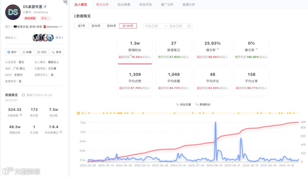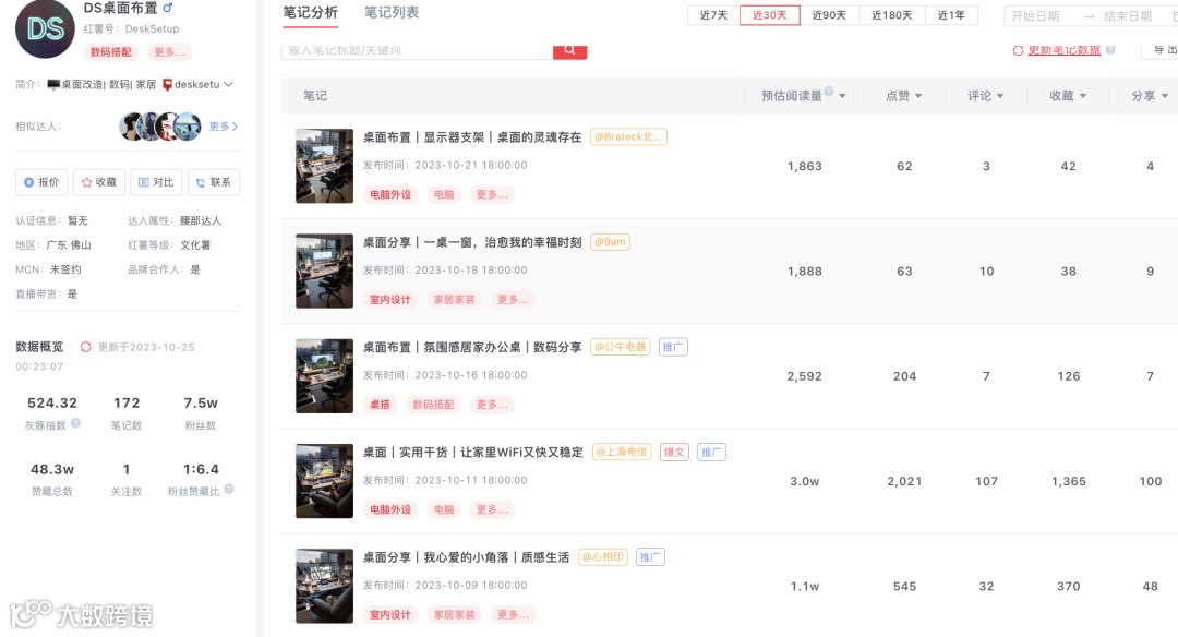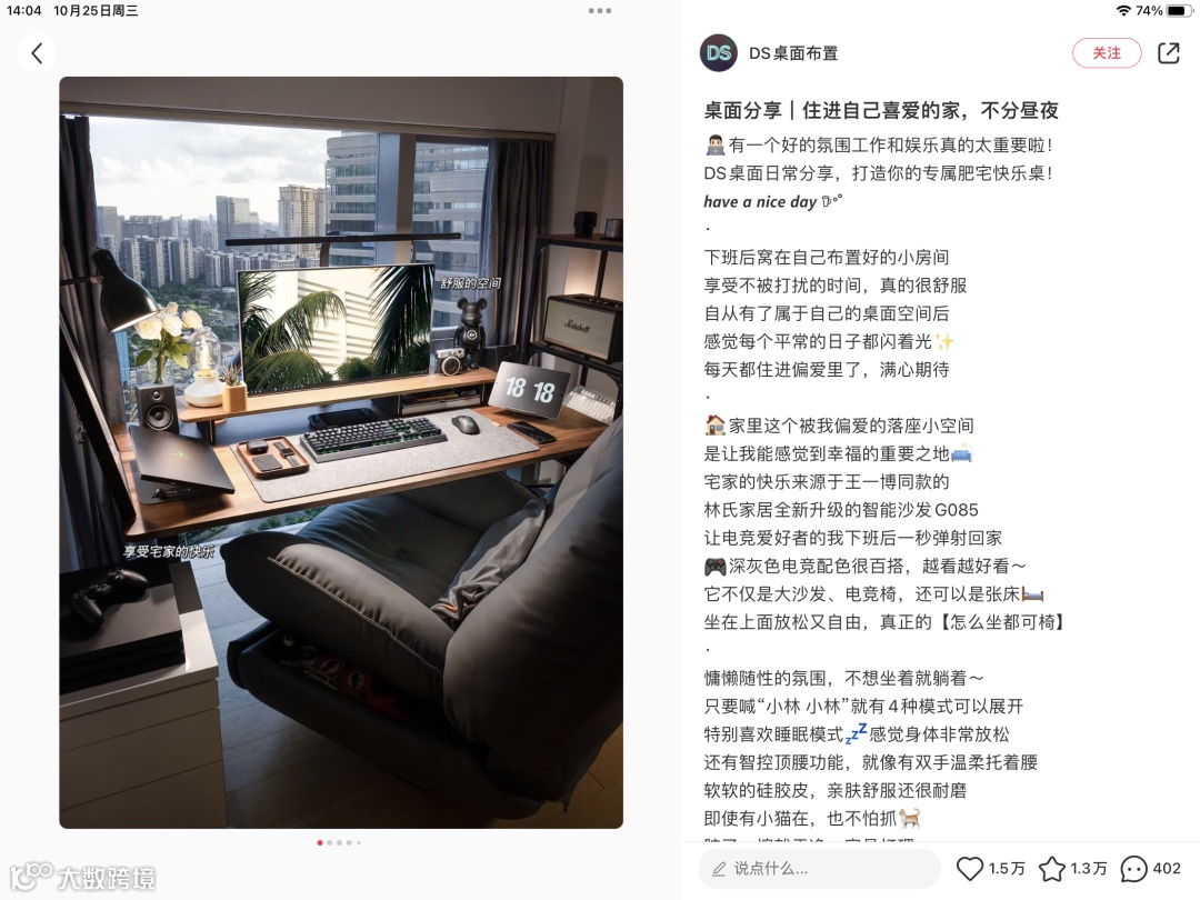 3. 氛围感+数码:DS桌面布置以桌面分享为主题,通过展示桌面布景和氛围感产品,获得了稳定的粉丝增长和商业笔记机会。