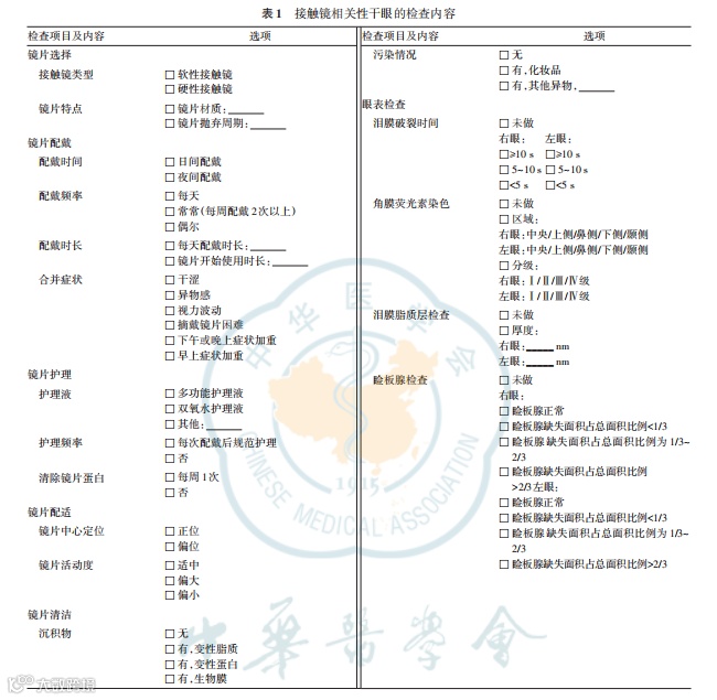 5.接触镜检查:镜片表面污损或沉积物形成,可导致镜片表面附水性降低,进而影响泪膜稳定性。对于接触镜配戴者,接触镜相关性干眼检查内容详见表1。
