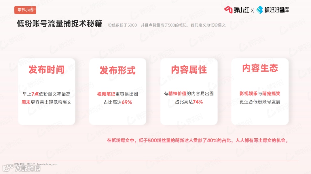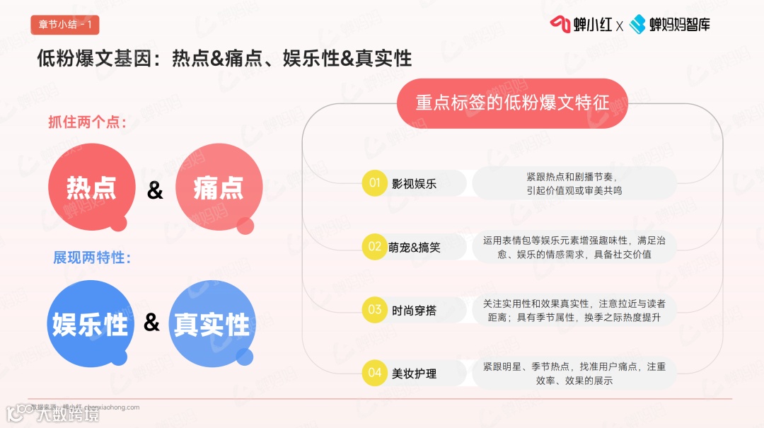根据蝉妈妈智库发布的《爆文狂潮中的黑马:探索小红书低粉丝账号的流量捕捉术》报告,总结了低粉爆文的4大特征,并从3个维度拆解了最具代表性的4个内容标签,提取“爆款基因”,探寻流量捕捉术。👇