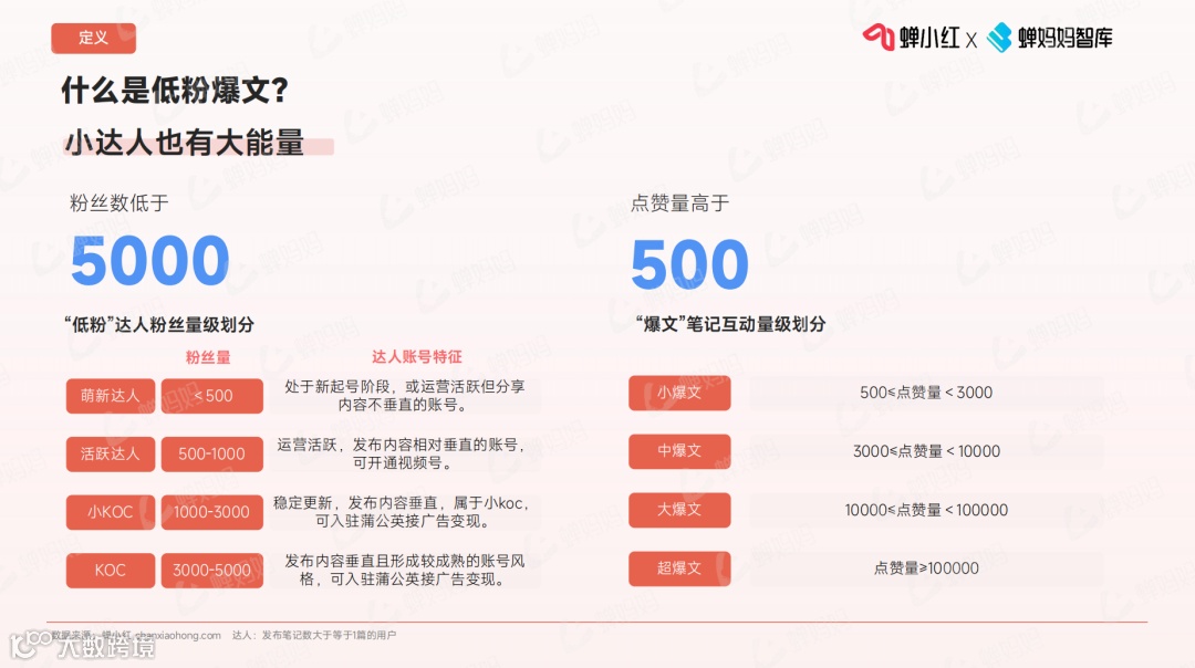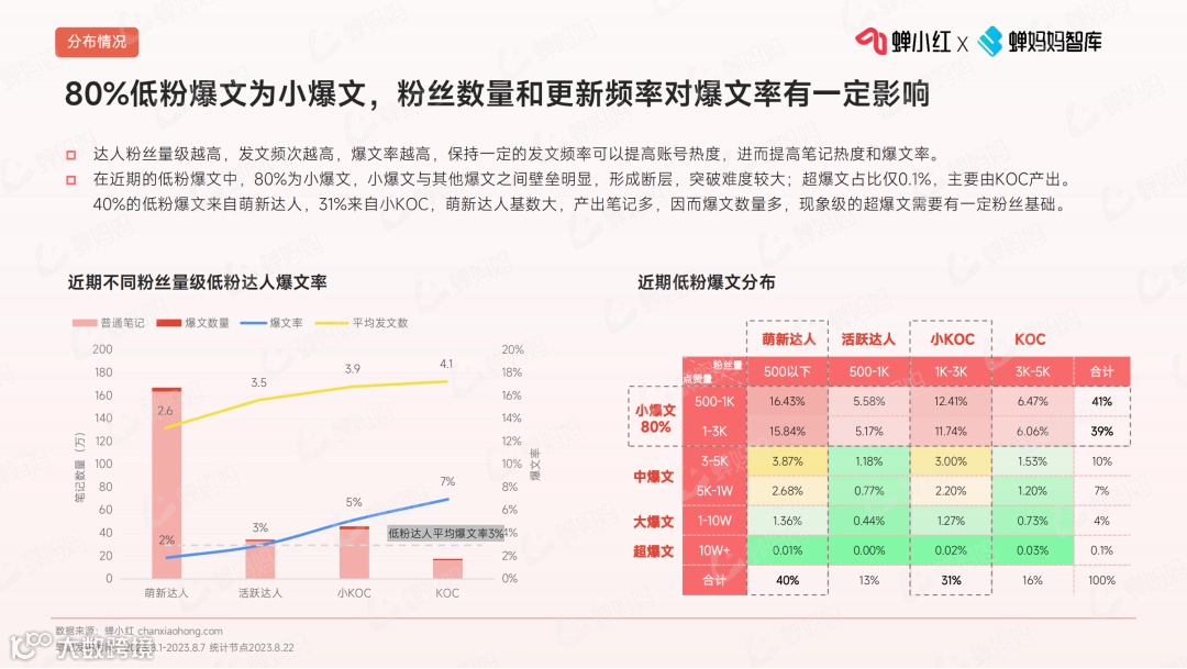 粉丝数低于5000,并且点赞量高于500的笔记,被定义为低粉爆文。80%低粉爆文为小爆文,粉丝数量和更新频率对爆文率有一定影响。📈