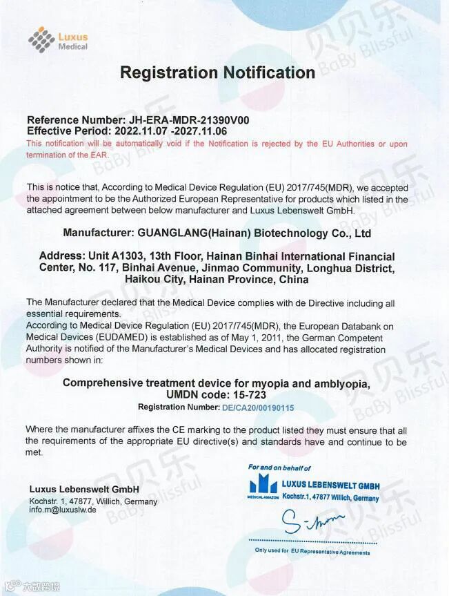 近日,由广州视景医疗软件有限公司旗下全资公司光朗(海南)生物科技有限责任公司自主研发的VR近视防控仪贝贝乐成功完成欧盟CE认证,符合欧盟相关要求和市场准入资质,为未来进军欧盟市场,开拓国际市场提前拿到了入场券。