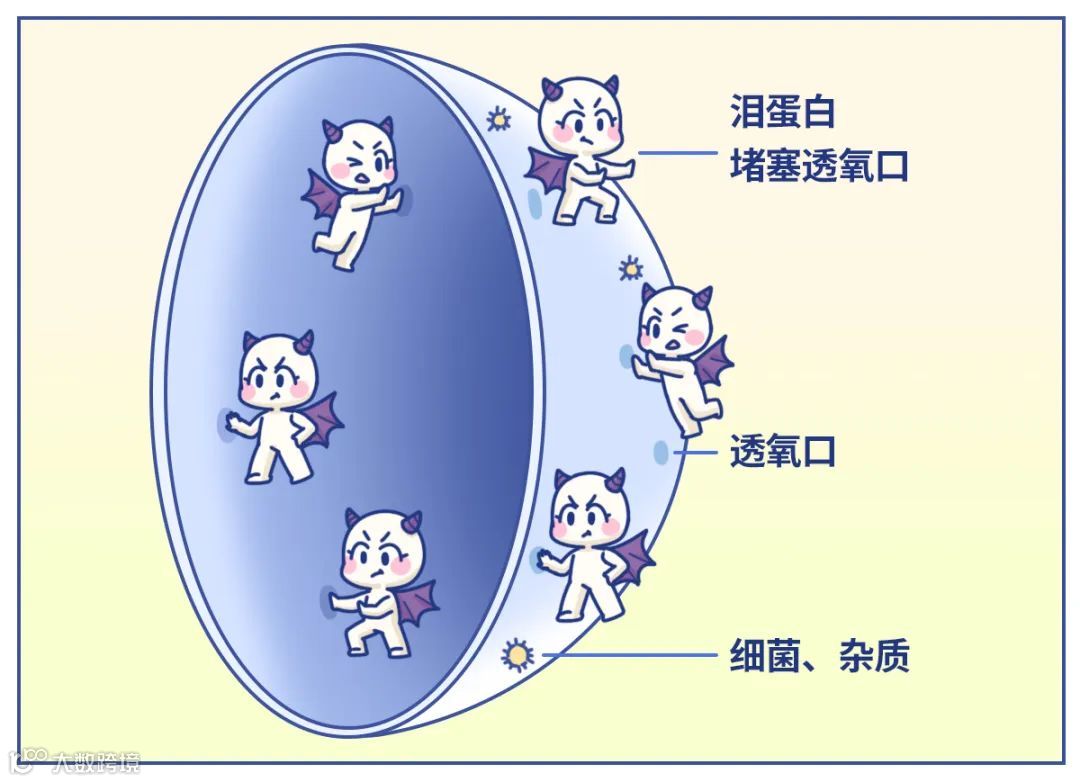 镜片的细孔们被堵住,抵达眼球的氧气量大打折扣,眼球就容易缺氧。眼球缺了氧,开始泛红、干涩,还让人看东西雾蒙蒙的。
