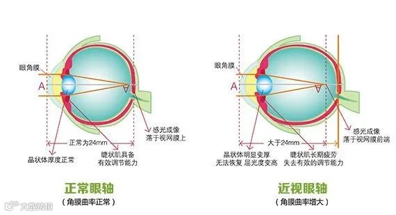 眼球突出是指眼球前后径,也就是眼轴变长。如果把眼睛比作一台光学仪器,那么从眼球接收光线的最表层角膜到感受光线的最内层视网膜的距离,可以看成是光学系统的一条中轴线,即眼轴,眼睛度数每增-3.00D,即300度近视,近视眼轴就会增长1mm。一般不是高度近视的人(小于600度),眼轴的增长在外观上并不明显。
