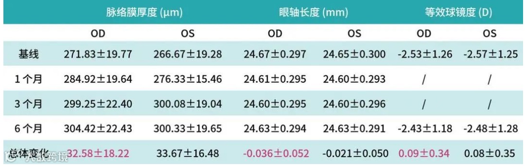 同时,贝贝乐还曾联合中山大学眼科中心开展了为期6个月的预实验,实验数据显示,使用贝贝乐6个月后,受试者的脉络膜厚度平均值显著增加,眼轴长度略有缩短,等效球镜度与基线相比基本不变,进一步说明贝贝乐对近视防控具有较好的效果。