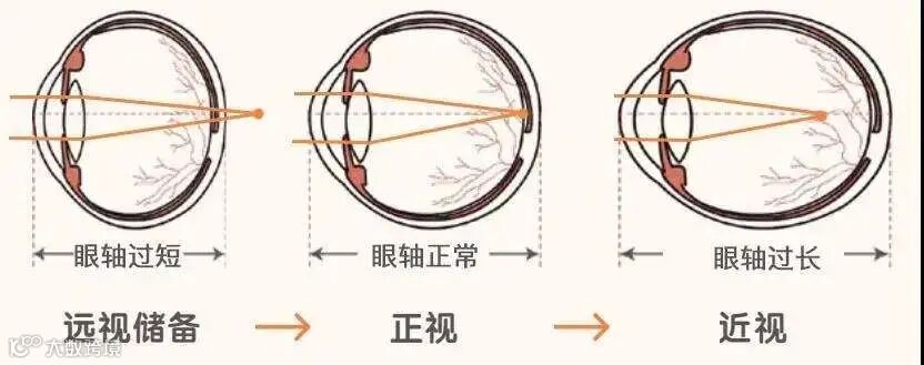 孩子刚出生的时候,眼轴在16mm左右,往往存在300度左右的远视。这个“远视储备”非常重要,决定着孩子未来近视的概率。随着年龄的增长,眼球增大,视力增加,远视减少,直至12岁左右转为正视眼。