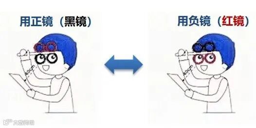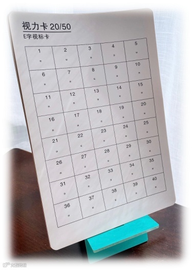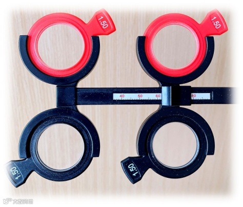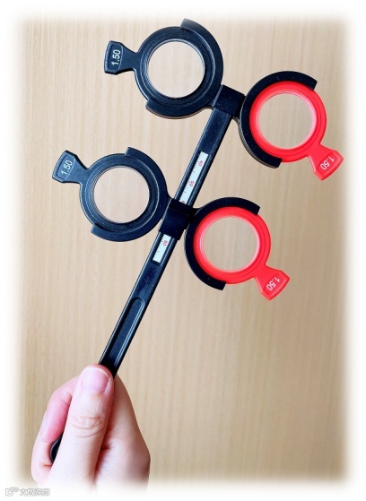 反转拍是一种小型的训练工具,它由一个支架、两个正镜(黑色框)和两个负镜(红色框)组成。训练过程中需要搭配近用视力卡使用,普遍应用是E字视标卡。在40cm处可以看清20/20视标,就表示有20/20的近视力。