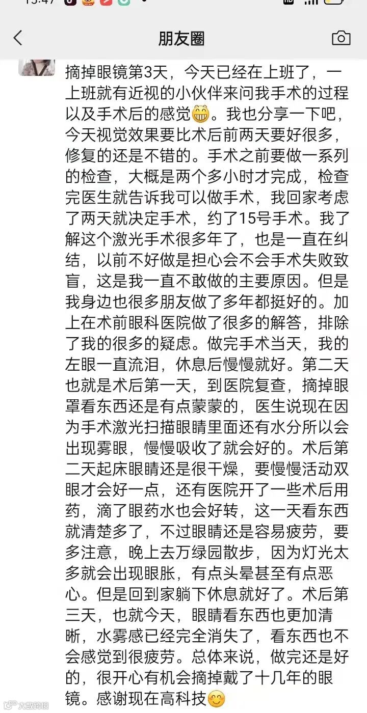 希望大家能像珍视生命一样,珍视眼睛。目前所有的近视手术只是矫正了视力,变长的眼轴无法回退,因此,因近视而可能产生的并发症并不会因为手术与否而改变。