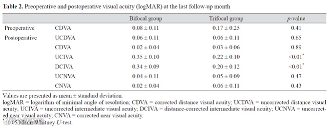2)术后视力:末次随访时,两组患者的术后CDVA均优于术前(双焦组p=0.04、三焦组p<0.01)。两组患者UCDVA、CDVA、NCNVA、CNVA均无统计学差异(p均>0.05),三焦点组患者的UCIVA、DCIVA均显著优于双焦点组,分别为0.22 VS 0.35 log MAR、0.20 VS 0.34 log MAR(p均<0.01)(表2)。即:三焦点IOL在保证远、近距离视力的情况下,提高了患者的中距离视力。