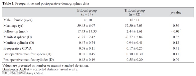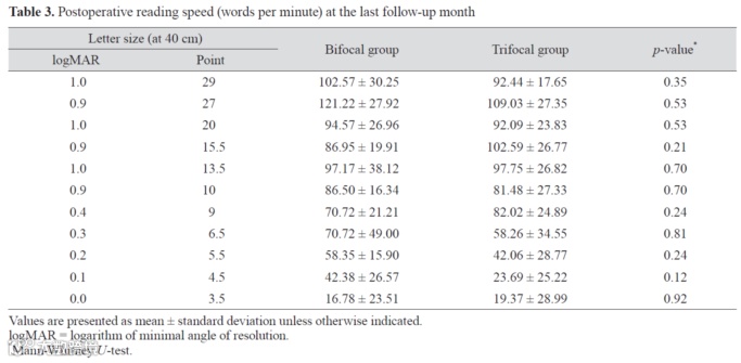 Kim M, Kim JH, Lim TH, Cho BJ. Comparison of Reading Speed after Bilateral Bifocal and Trifocal Intraocular Lens Implantation. Korean J Ophthalmol. 2018 Apr;32(2):77-82. doi: 10.3341/kjo.2017.0057. Epub 2018 Mar 19. PMID: 29560618; PMCID: PMC5906405.
