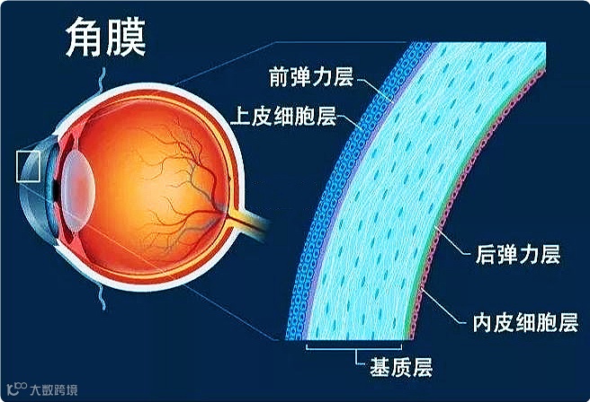 人的角膜分为五层,做角膜手术的部位在基质层,这一层最厚占全角膜厚度的90%且不可再生,角膜近视手术就是利用了其不可再生的特性,通过手术切削,达到光学矫正的作用。