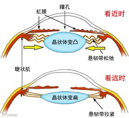 一般来说,当我们看远的时候,睫状肌处于放松的状态;当我们看近的时候,睫状肌会收缩,而使得与它相连的悬韧带松弛,晶状体就会变凸,屈光力增强,汇聚光线的能力更强,从而使眼睛能看清近处的物体。
