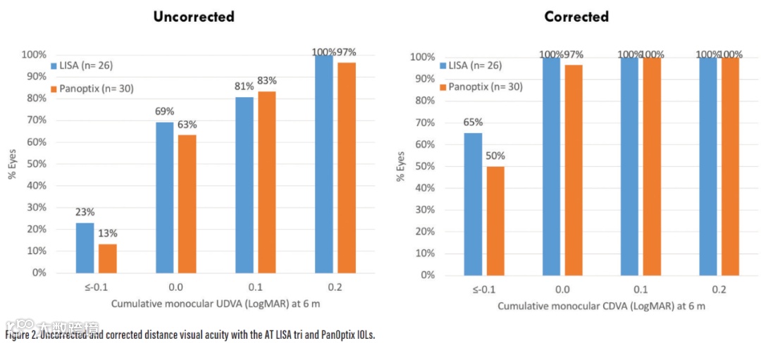 术后3月,两组患者的屈光状态相近。AT LISA tri 839MP组的远距离及中距离(70cm)视力更优。