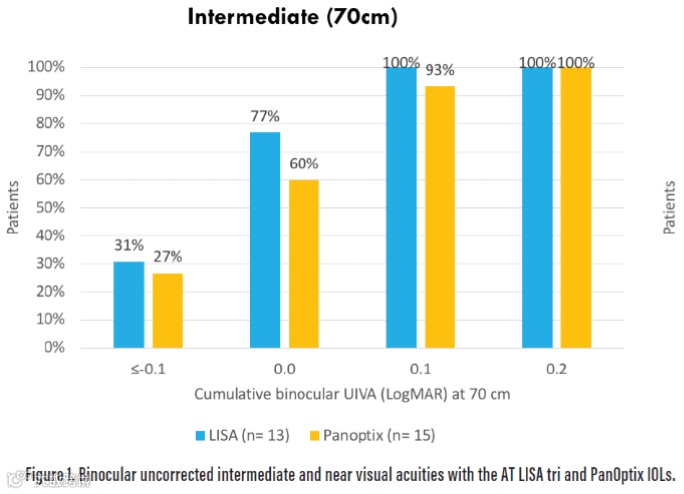 其中70cm处的UIVA,AT LISA tri 839MP组患者80%术后达到logMAR0.0以上,而另一组仅有60%。关于40cm处的近距离视力,AT LISA tri 839MP组所有患者均达到N4.5以上。植入AT LISA tri 839MP的老视矫正患者对于术后近距离视力非常满意。