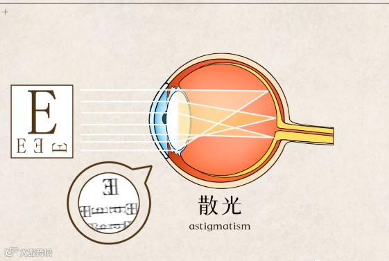 散光与角膜的弧度有关,平行光线进入眼内后,由于眼球在不同子午线上屈光力不等,不能聚焦于一点(焦点),就不能形成清晰的物像,这种情况称为散光。看东西重影,视觉容易疲劳,是散光患者的典型症状。