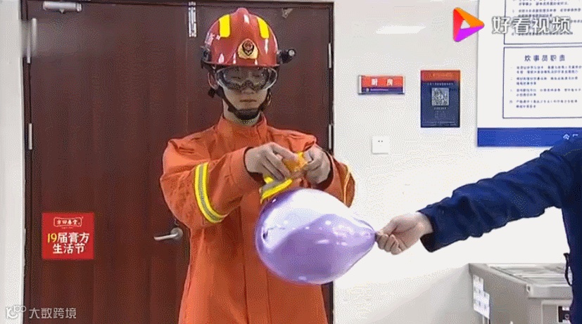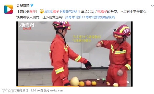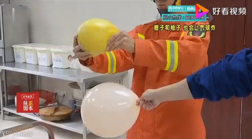 上面是消防员做的实验,在剥橘子的过程中,汁水溅出来之后,气球就“嘭”地炸开了。