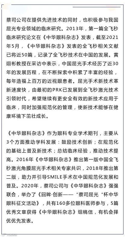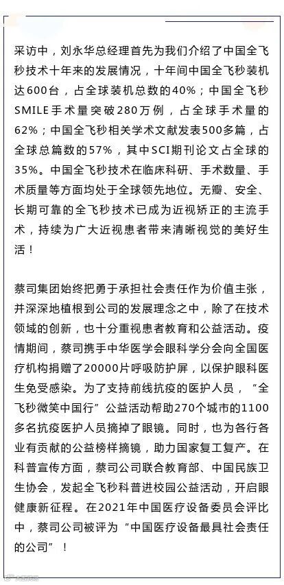 作为见证中国眼视光发展的领衔人物,瞿佳教授在采访中表达了对蔡司公司全飞秒激光的先进技术和治疗效果的肯定,同时也对全飞秒中国280万例手术表达了祝贺,瞿教授认为随着蔡司公司不断发展壮大,提供了全生命周期的眼健康解决方案。期待未来进一步关注视觉质量的改善,不仅是屈光度数的变化,更多的是追求眼表质量和视觉功能的改善,对干眼、视疲劳等问题更加深入的研究,提供更加安全有效的眼健康服务!