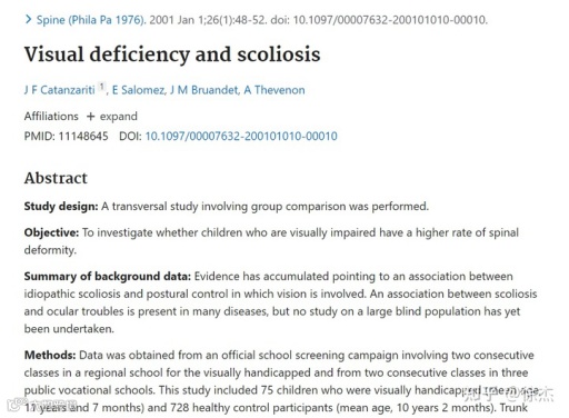2001年,法国科学家将75名视力障碍的儿童和728名视力正常的儿童进行对比研究。两组儿童的平均年龄为10到11岁之间。研究人员使用标准的脊柱侧弯测量方法,通过X光片和亚当测试进行筛查对比。结果显示:有视力障碍的儿童,脊柱侧弯的风险是对照组的2倍。另一个意外的发现是,18名脊柱侧弯的儿童还伴随斜颈。研究者认为斜颈可能是为了弥补视觉障碍,从而导致了脊柱侧弯。