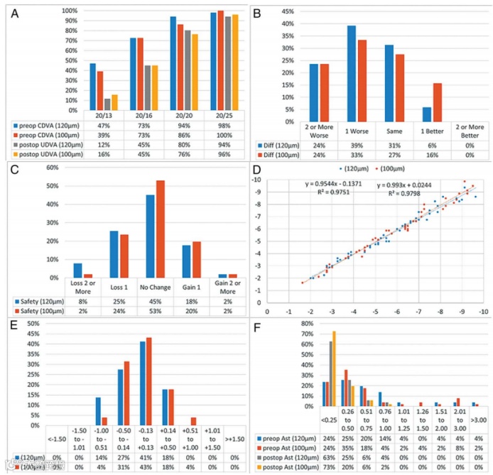 屈光度及视力:术后3个月,在51名患者(102眼)中,帽120μm组的等效球镜相较于100μm组略呈欠矫结果,差异为0.06 ± 0.39 D (0.7% ± 5.7%),但是该差异无统计学意义。术后两组间散光和术后视力的差异也无统计学意义。