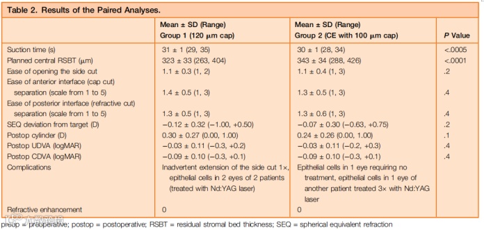 帽100 μm组术后中央剩余角膜基质厚度相较于120 μm组厚20 ± 15 μm,两组的并发症发生率相同。