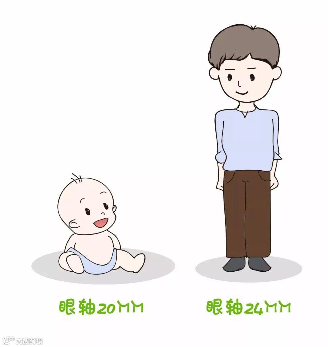 像身体的其他部位一样,眼轴会逐渐发育,通常新生儿的眼轴要到七、八岁左右才基本发育完全,正常视力的眼轴长度其平均值约为24mm,而近视人群的眼轴长度通常大于24mm。