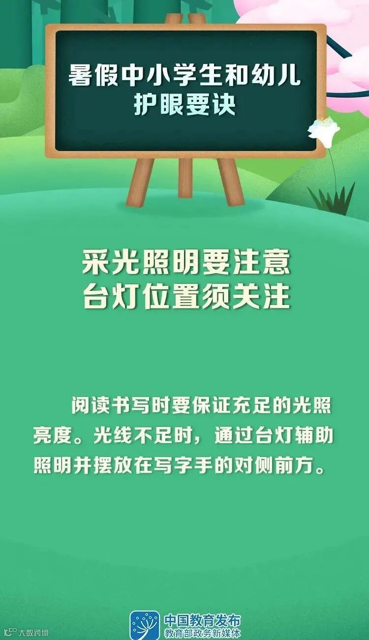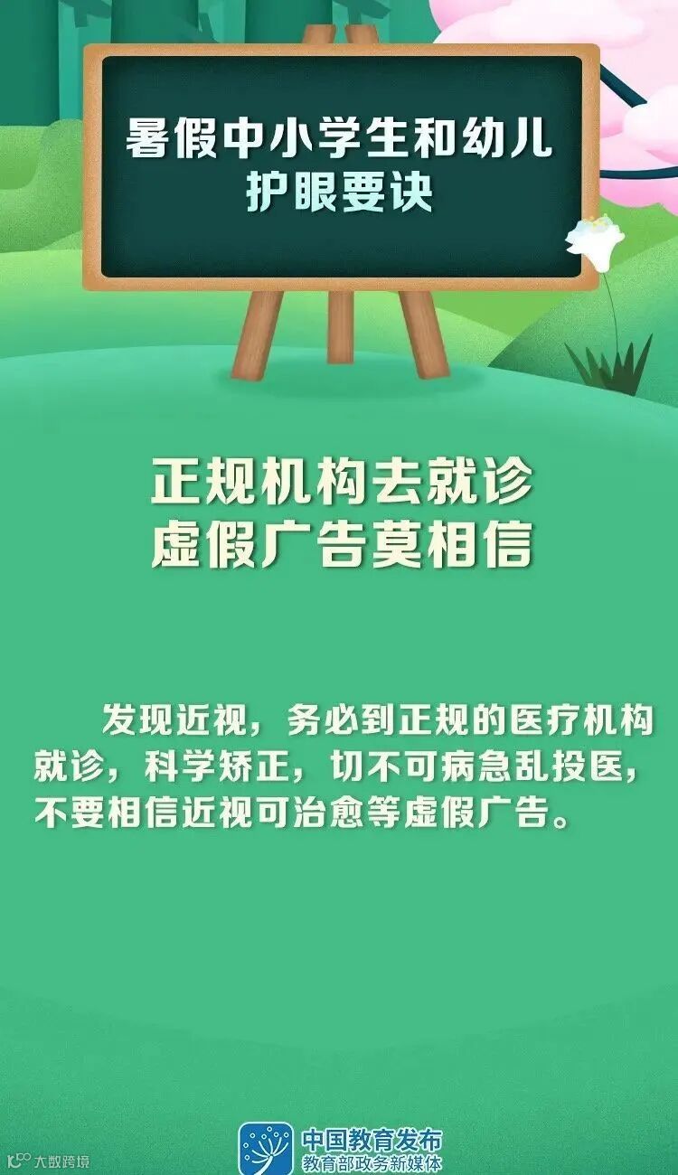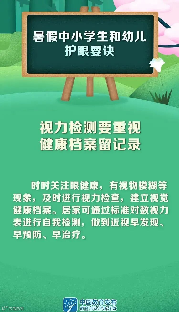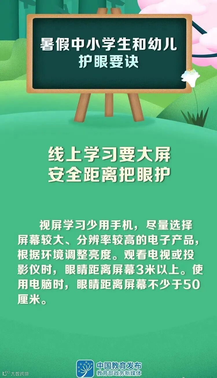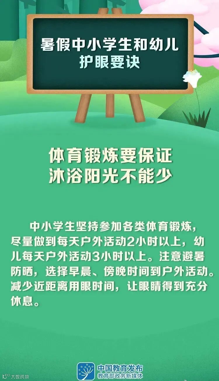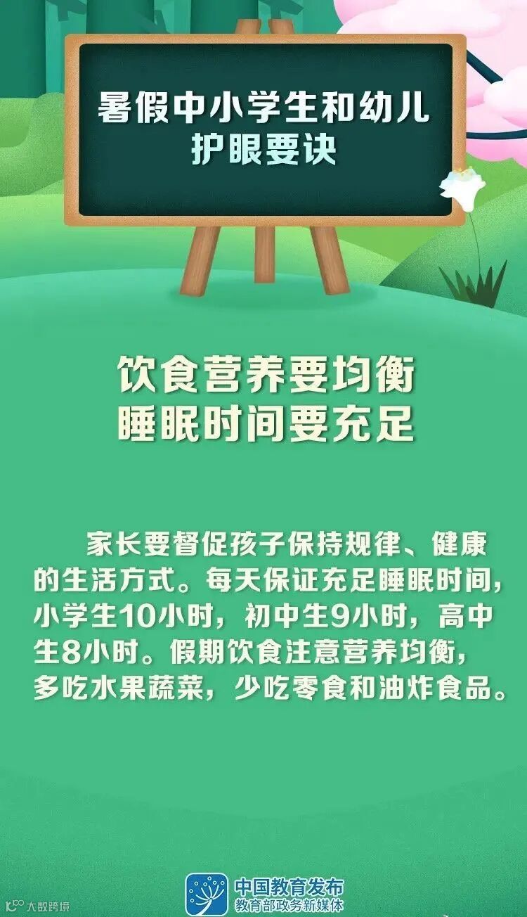 日前,教育部指导全国综合防控儿童青少年近视专家宣讲团,提出2021年暑假中小学生和幼儿护眼要诀,倡导广大中小学生和幼儿假期科学合理安排好生活、学习,科学健康护眼。一起看大图学要诀。