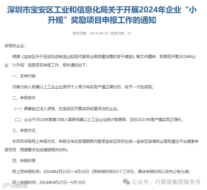 根据《宝安区关于促进先进制造业和现代服务业高质量发展的若干措施》等文件精神,我局现开展2024年企业“小升规”奖励项目申报工作,相关通知如下: