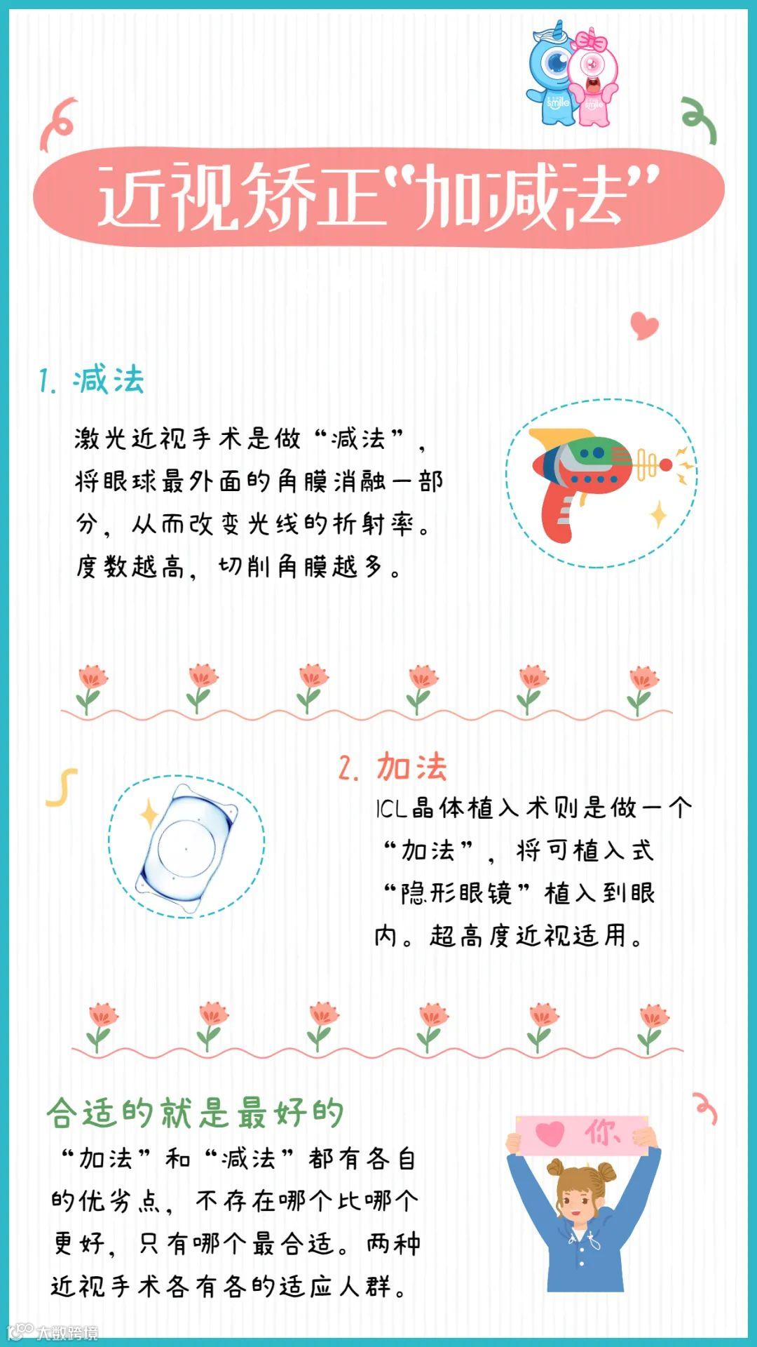 无论是“加法”还是“减法”都有各自的优劣点,并不存在哪个比哪个更好,只有哪个最合适。两种近视手术各有各的适应人群。
