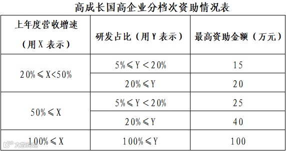 本资助计划资助金额受区科技资金年度总额控制,对上一年度认定通过且营业收入不低于1000万元的国家高新技术企业,根据上一年度企业营收增速、研发投入比例数据给予综合考核,并根据考核结果分档次给予相应资助,每家最高资助100万元。资助标准如下: