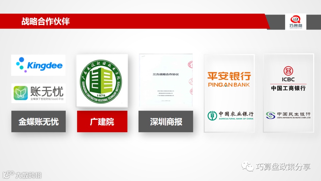 ·2019年,公司成为中国民生银行深圳分行战略合作服务商;同年9月,巧算盘集团联合中国民生银行深圳分行举办《企业“心”税法》公益课堂;