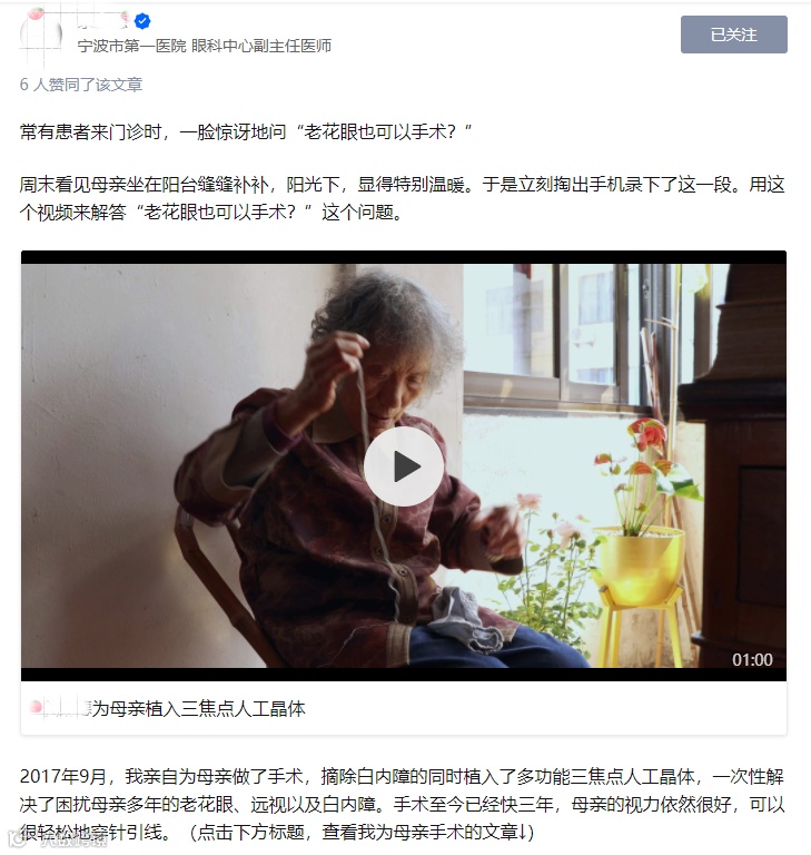 在知乎上,有认证为某医院眼科中心副主任医师的用户,分享了一张老母亲在阳台上缝缝补补的视频,视频里,满头白发的老太太精神矍铄,穿针引线十分流畅。