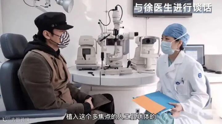 视频的开始,胡兵讲述了自己的困扰:看不清楚剧本,严重影响了他拍戏;平常生活中如果需要填表,也很困难。他这个描述,是很典型的老花症状,总结一下就是:双眼看近不清。检查发现,除了老花,胡兵的晶状体也有一定程度的混浊,也就是白内障。经过沟通,胡兵接受医生给出的解决方案——做三焦点人工晶体置换术。