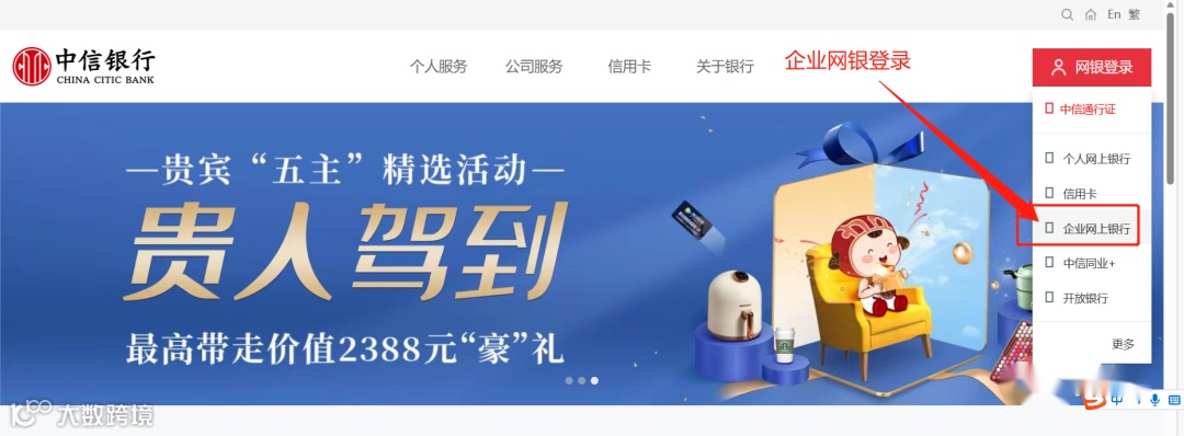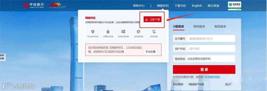 网页浏览器搜索中信银行官方网站,点击企业网上银行登录,首次登陆需要下载网银伴侣,点击下载安装