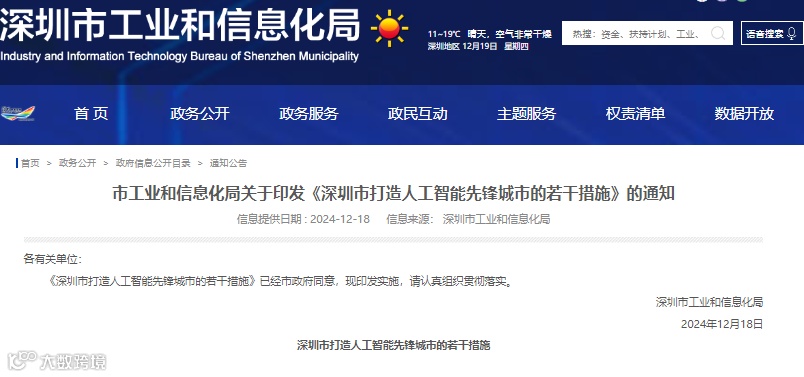 深圳市工业和信息化局印发《深圳市打造人工智能先锋城市的若干措施》。措施提出,发放“训力券”。每年发放最高5亿元“训力券”降低人工智能模型研发和训练成本。对租用智能算力开展大模型训练的企业、高等院校和科研机构,按不超过服务合同金额的50%,给予最高1000万元资助,对初创企业提高资助比例至60%。