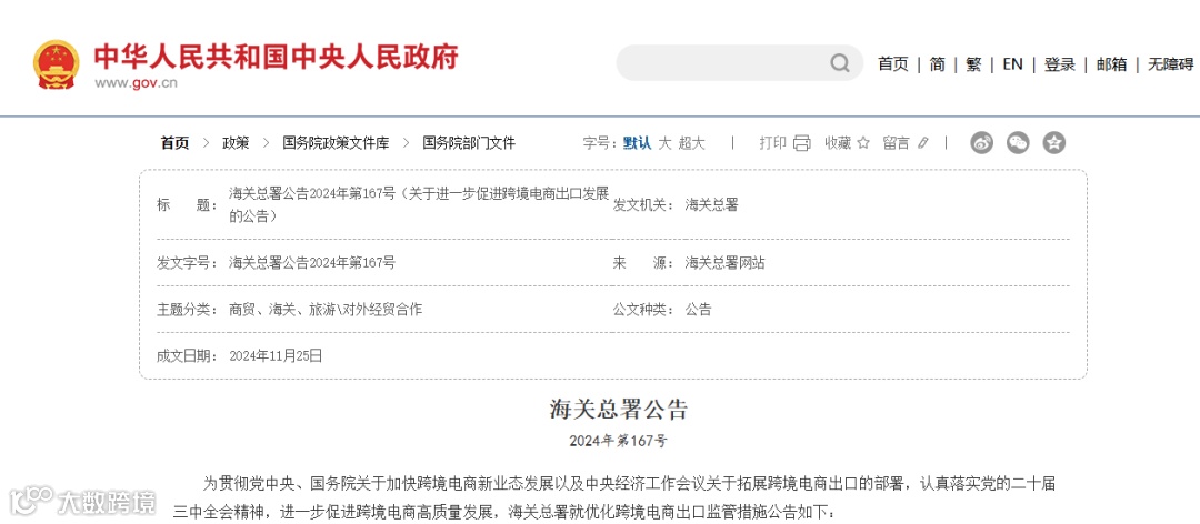 为贯彻党中央、国务院关于加快跨境电商新业态发展以及中央经济工作会议关于拓展跨境电商出口的部署,认真落实党的二十届三中全会精神,进一步促进跨境电商高质量发展,海关总署就优化跨境电商出口监管措施公告如下: