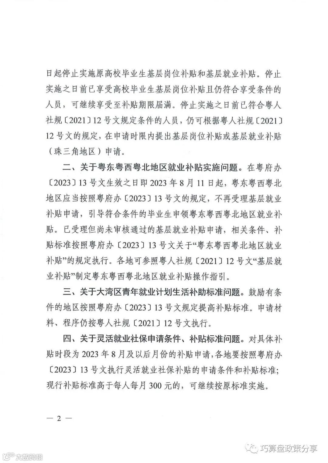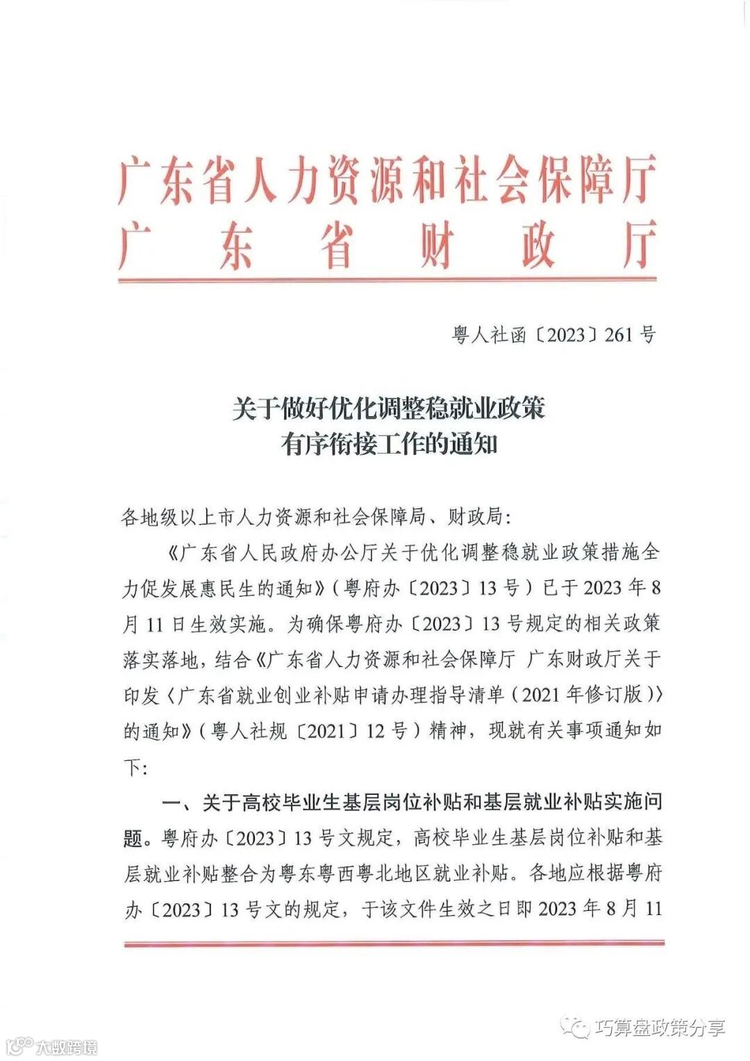 根据(粤人社函【2023】261号)文件执行,文件内容指出:“2023年8月11日起停止实施原高校毕业生基层岗位补贴和基层就业补贴。”