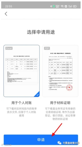 4、在类型页面,选择用于个人对账,接着单击申请。