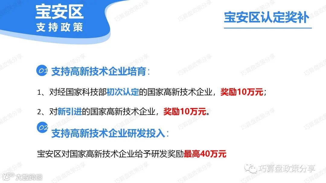 最近宝安区科技创新局在各街道巡回开展2023年度国家高新技术企业认定申报宣讲会,其中谈到了宝安区高新认定最新出台的奖补政策,快来了解一下吧~