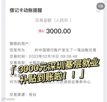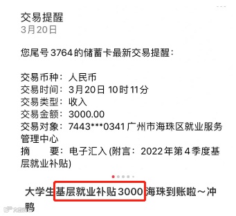 基层就业补贴到账截图