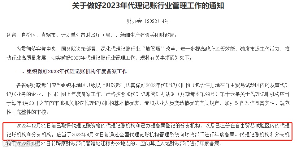 所有代理机构应当于2023年4月30日前通过全国代理记账机构管理系统向财政部门进行年度备案。