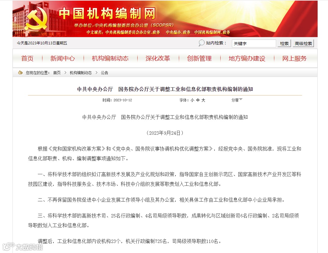 根据《党和国家机构改革方案》和《党中央、国务院议事协调机构优化调整方案》,经报党中央、国务院批准,现将工业和信息化部职责、机构、编制调整,2024年由工信部管理国家高新技术企业认定工作。