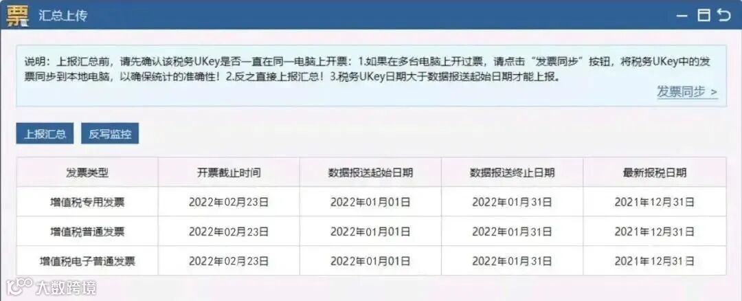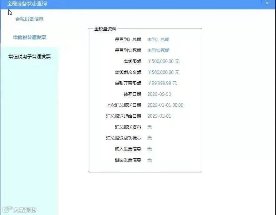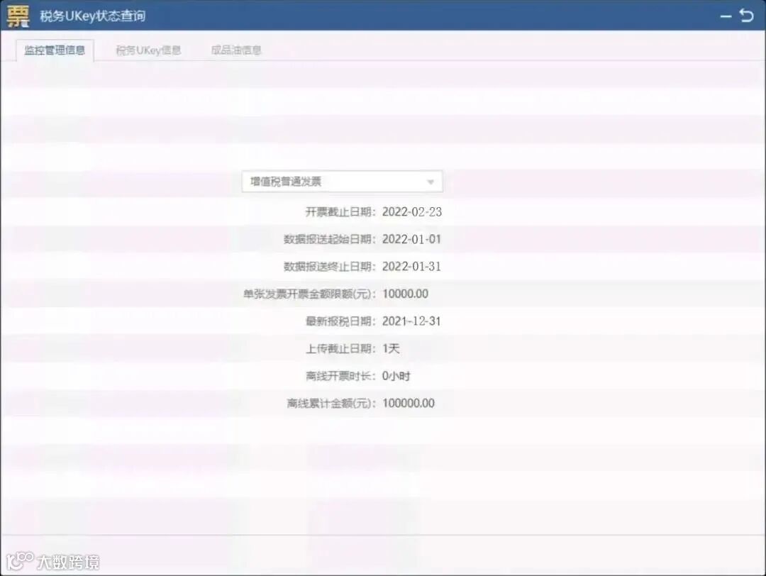 系统设置-税务UKey设置-税务UKey状态信息,弹出“税务UKey状态查询”窗口,系统默认显示在监控管理信息选项卡,查看各发票种类“开票截止时间”更新至2022年1月说明反写成功。