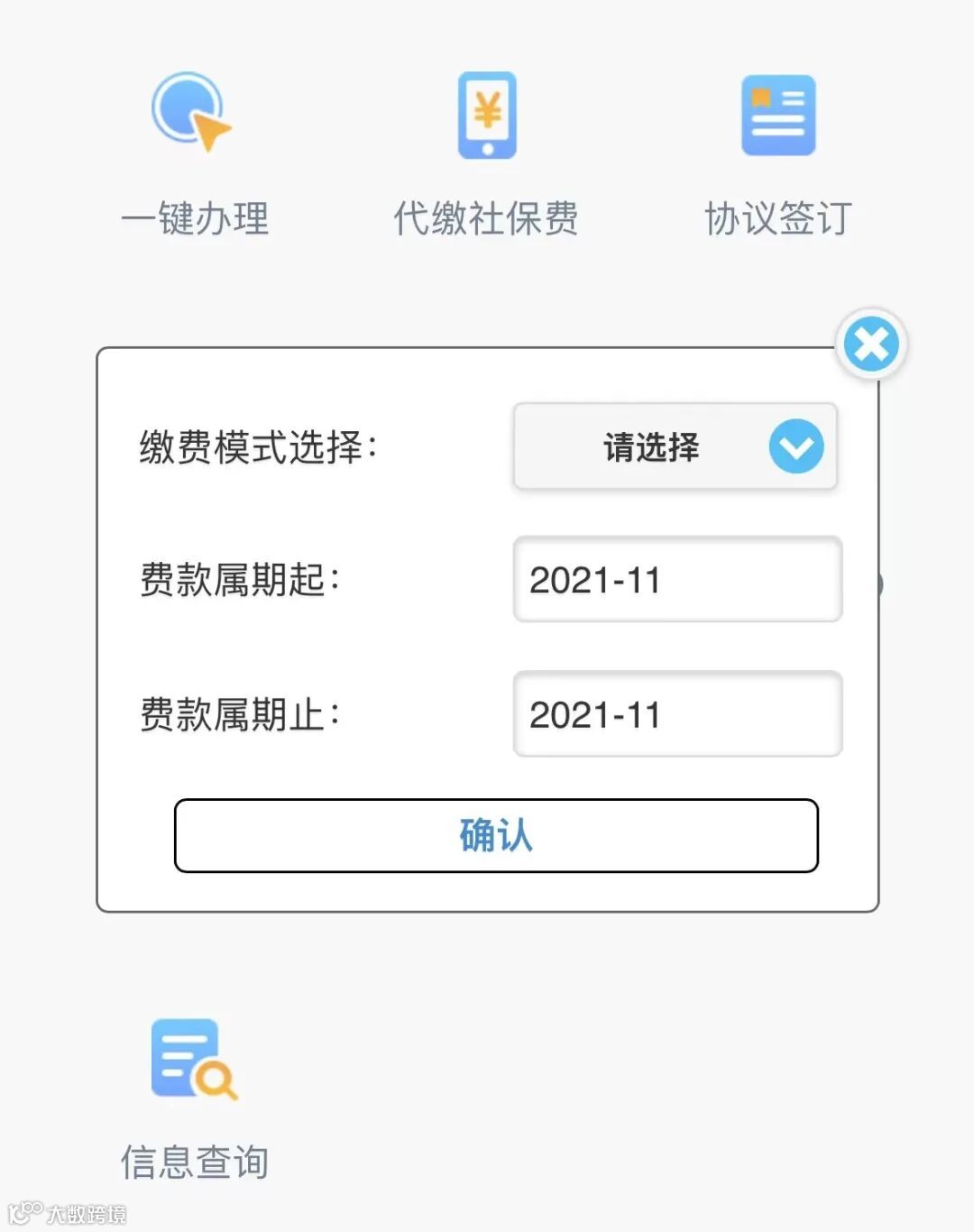 “协议扣款模式”需要选择正确的费款属期起止才会有缴费数据哦,“微信扣款模式”无需选择费款属期起止。