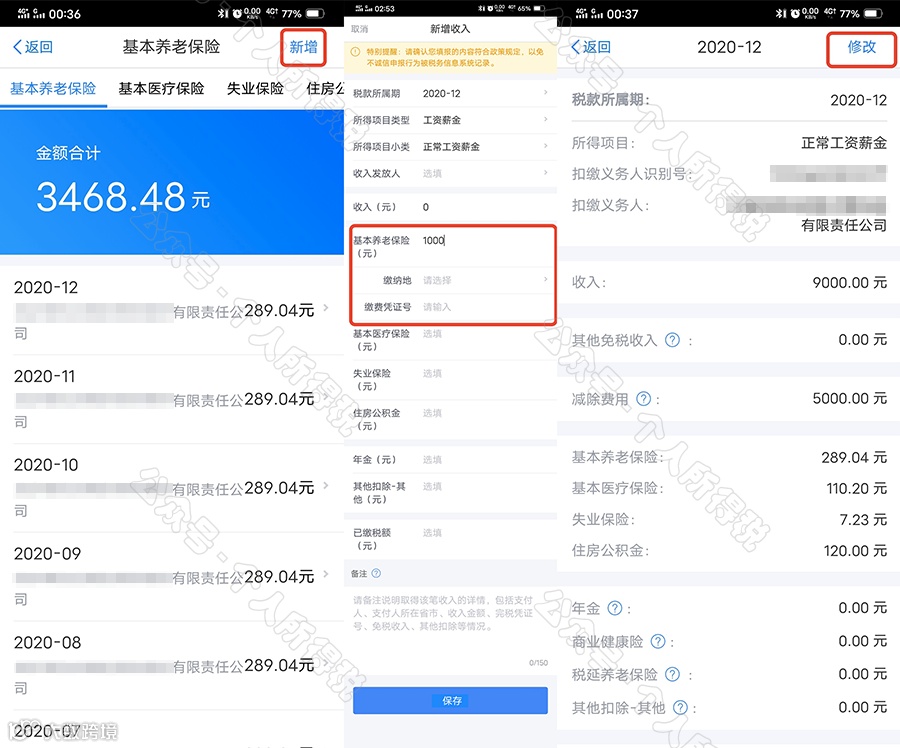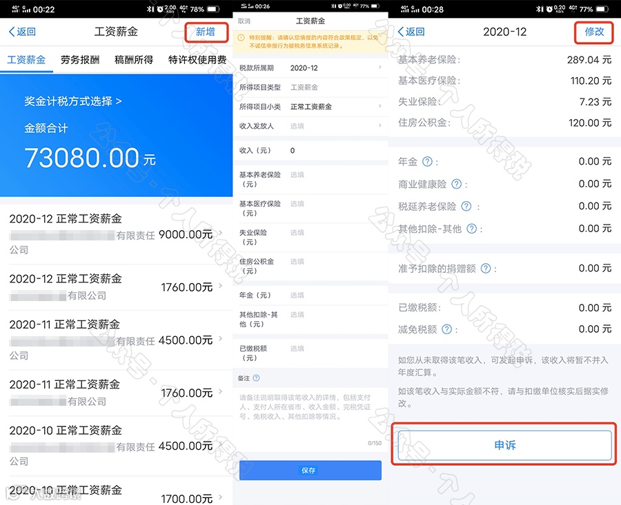 点击除专项附加扣除之外的明细数据可进入对应详情界面,您可进行【新增】、【修改】、【申诉】等操作,步骤同前一步的(一)完善收入数据一致。