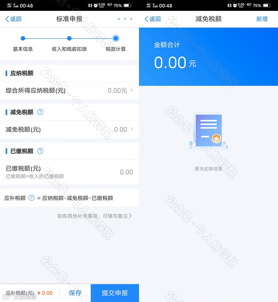 如您有减免税事项(残疾、孤老人员、烈属),可以点击【减免税额】新增相关信息。确认结果后,点击【提交申报】。