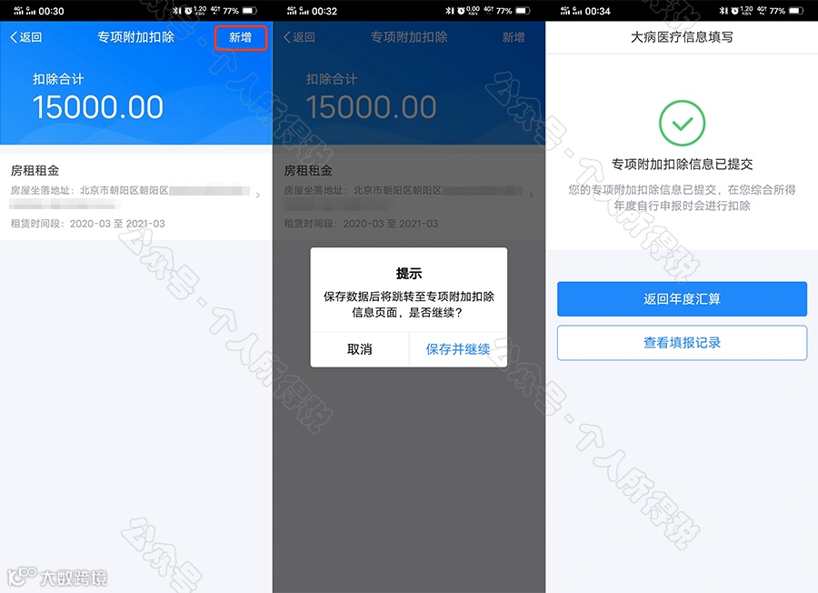 若您需要新增或修改专项附加扣除信息,可点击【新增】,跳转至采集界面后进行填报。填报完成后,可选择跳转回年度汇算继续填报。